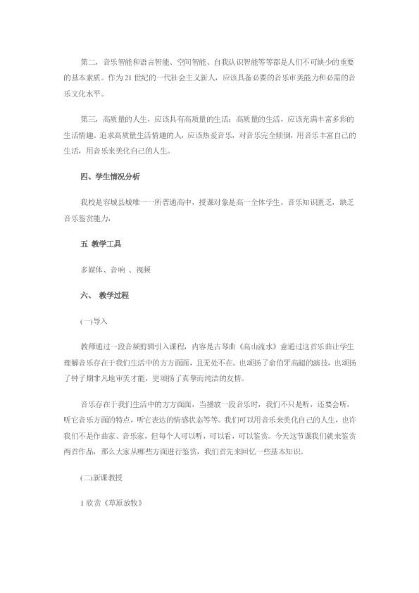 ***,授课对象是高一全体学生,音乐知识匮乏,缺乏音乐鉴赏能力,