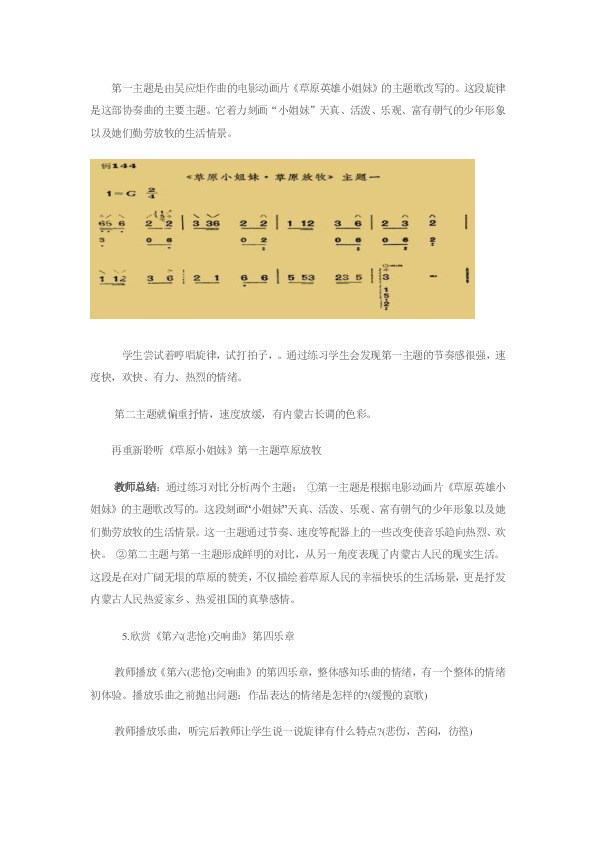 教师总结:通过练习对比分析两个主题: ①第一主题是根据电影动画片《草原英雄小姐妹》的主题歌改写的。这段刻画“小姐妹”天真、活泼、乐观、富有朝气的少年形象以及她们勤劳放牧的生活情景。这一主题通过节奏、速度等配器上的一些改变使音乐趋向热烈、欢快。 ②第二主题与第一主题形成鲜明的对比,从另一角度表现了内蒙古人民的现实生活。这段是在对广阔无垠的草原的赞美,不仅描绘着草原人民的幸福快乐的生活场景,更是抒发内蒙古人民热爱家乡、热爱祖国的真挚感情。