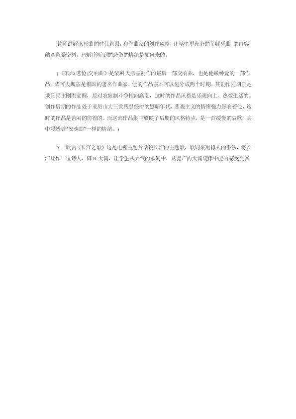 教师讲解该乐曲的时代背景,和作曲家的创作风格,让学生更充分的了解乐曲 的内容,结合背景资料,理解所听到的悲伤的情绪是如何来的。