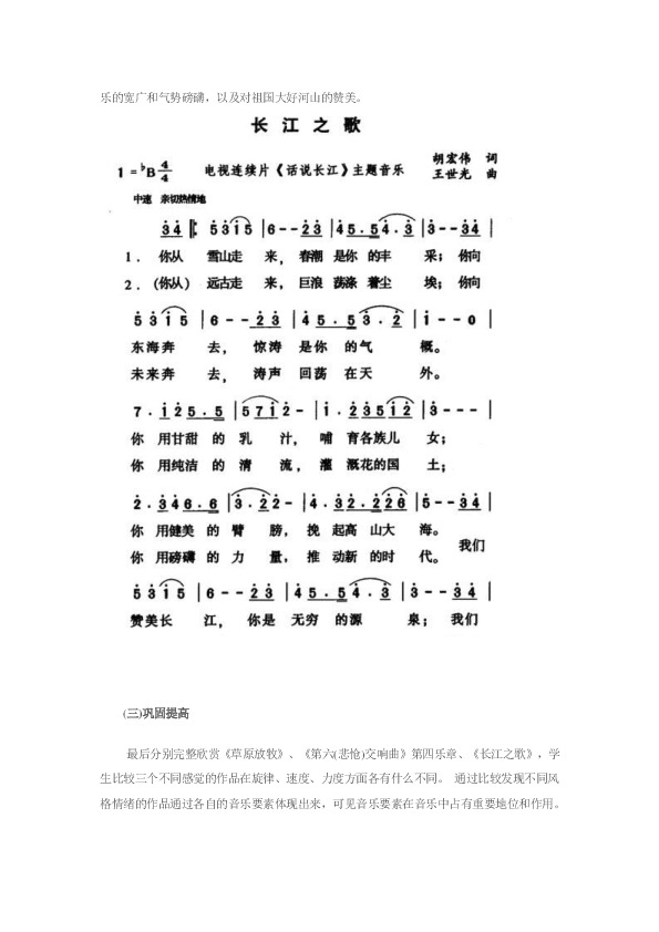 欣赏《长江之歌》这是电视主题片话说长江的主题歌,歌词采用拟人的手法,将长江比作一位诗人,降B大调,让学生从大气的歌词中,从宽广的大调旋律中能否感受到音乐的宽广和气势磅礴,以及对祖国大好河山的赞美。