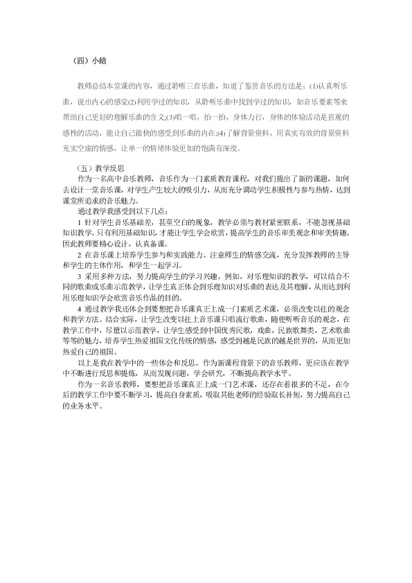 以上是我在教学中的一些体会和反思。作为新课程背景下的音乐教师,更应该在教学中不断进行反思和提炼,从而发现问题,学会研究,不断提高教学水平。