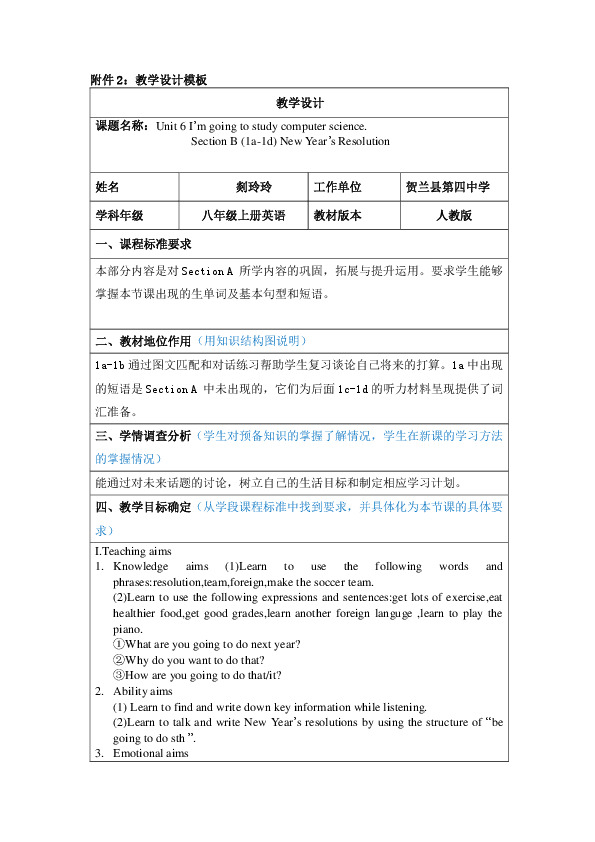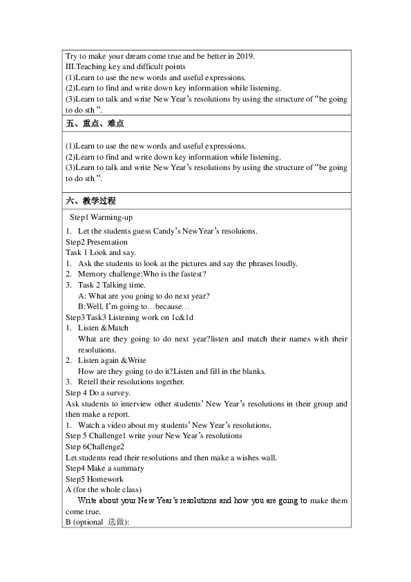 (2)Learn to talk and write New Year’s resolutions by using the structure of “be going to do sth ”.