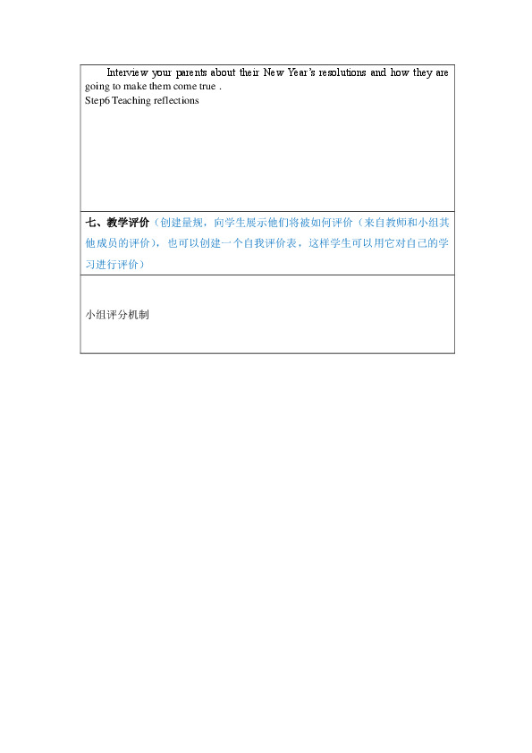 七、教学评价(创建量规,向学生展示他们将被如何评价(来自教师和小组其他成员的评价),也可以创建一个自我评价表,这样学生可以用它对自己的学习进行评价)