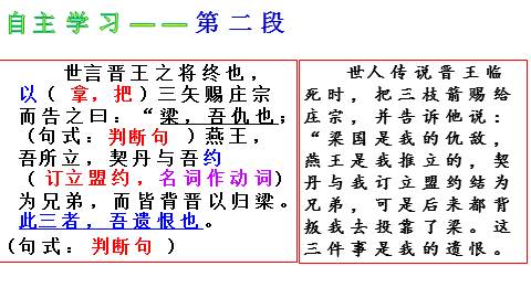 世人传说晋王临死时,把三枝箭赐给庄某某,并告诉他说:“梁某某是我的仇敌,燕王是我推立的,契丹与我订立盟约结为兄弟,可是后来都背叛我去投靠了梁。这三件事是我的遗恨。
