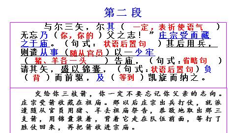 交给你三枝箭,你一定不要忘记你父亲的志向。庄某某受箭收藏在祖庙。那以后庄某某出兵打仗,就派遣随从官员用猪、羊去祖庙祭告,恭敬地取出那三支箭,用锦囊装着,背着它走在队伍前面,等打了胜仗回来,再把箭收进宗庙。