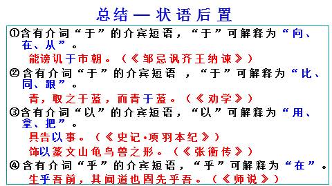 ①含有介词“于”的介宾短语,“于”可解释为“向、在、从”。