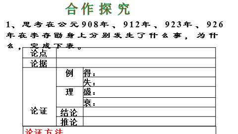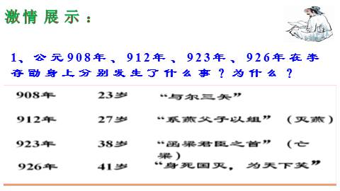 1、思考在公元908年、912年、923年、926年在李存勖身上分别发生了什么事,为什么,完成下表。