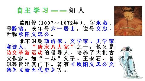 北宋时期政治家、文学家、史学家和诗人,“唐宋八大家”之一。他又是诗文革新运动的倡导人,培养了大批古文作家。如“三苏”父子、王安石、曾某某等皆出其门下。著有《欧阳文忠公文集》《新五代史》等。