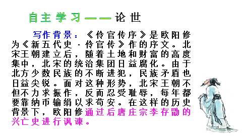 写作背景:《伶官传序》是欧阳某某《新五代史XXXXX伶官传》作的序文。北宋王朝建立后,随着土地和财富的高度集中,北宋的统治集团日益腐化。由于北方少数民族的不断进犯,民族矛盾也日益尖锐。面对这种形势,北宋王朝不但不力求振作,反而忍受耻辱,每年都要靠纳币输绢以求苟安。在这样的历史背景下,欧阳修通过后唐庄某某李存勖的兴亡史进行讽谏。