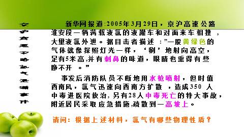 新华网报道:2005年3月29日,京沪高速公路淮安段一辆满载液氯的液罐车和对面来车相撞 ,大量液氯外泄。据目击者描述 : ”一股黄绿色的气体就像探照灯光一样,‘唰’地射向高空,足有5米某某,并有刺鼻的味道,眼睛也熏得有些睁不开 。”