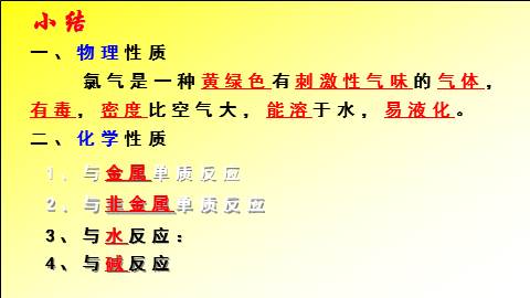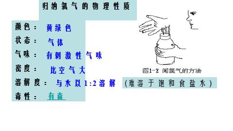 氯气是一种黄绿色有刺激性气味的气体,有毒,密度比空气大,能溶于水,易液化。