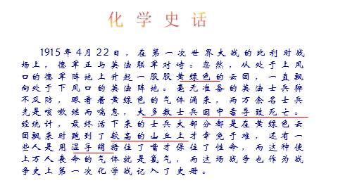 1915年4月22日,在第一次世界大战的比利时战场上,德军正与英法联军对峙。忽然,从处于上风口的德军阵地上升起一股股黄绿色的云团,一直飘向处于下风口的英法阵地。毫无准备的英法士兵猝不及防,眼看着黄绿色的气体涌来,两万余名士兵先是咳嗽继而喘息,大多数士兵因中毒导致死亡。经统计,最终活下来的士兵大部分都是在黄绿色云团飘来时跑到了较高的山丘上才幸免于难,还有一些人是用湿手绢捂住了嘴才保住了性命,而这种使上万人丧命的气体就是氯气,而这场战争也作为战争史上第一次化学战记入了史册。