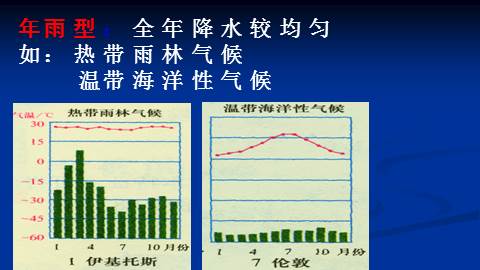4.温带海洋性气候:终年温和湿润,多雨多雾,光热不足,不利于谷物的成熟,但是有利于多汁牧草的生长