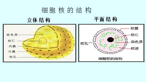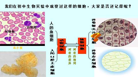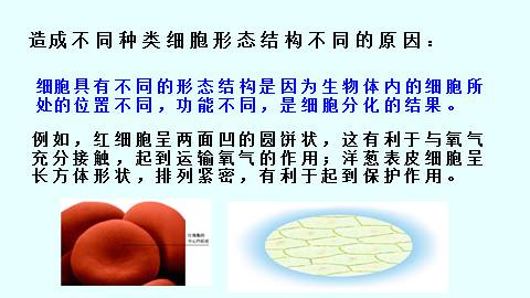 我们在初中生物实验中观察过这样的细胞,大家是否还记得呢?人的血细胞人的口腔上皮细胞洋葱根尖分生细胞洋葱表皮细胞白细胞红细胞血小板动物细胞植物细胞两者的差异?两者的相同第二节 细胞的多样性和统一性不同的细胞,其形态、结构、功能千差万别—多样性不同的细胞有共同的结构—统一性造成不同种类细胞形态结构不同的原因:例如,红细胞呈两面凹的圆饼状,这有利于与氧气充分接触,起到运输氧气的作用;洋葱表皮细胞呈长方体形状,排列紧密,有利于起到保护作用。细胞具有不同的形态结构是因为生物体内的细胞所处的位置不同,功能不同,是细胞分化的结果。细胞核的结构立体结构平面结构原核细胞结构