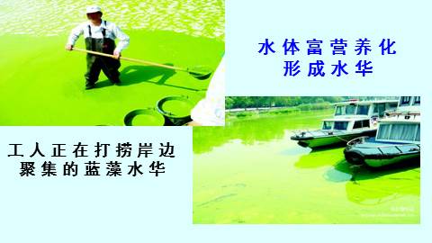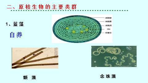 肽聚糖细胞壁较大较小细胞大小真核细胞原核细胞类别原核细胞与真核细胞的比较二、原核生物的主要类群颤 藻 念珠藻1、蓝藻自养工人正在打捞岸边聚集的蓝藻水华 水体富营养化形成水华 没有成形的细胞核,有拟核——环状DNA藻蓝素和叶绿素—能进行光合作用只有核糖体细胞器宏观:当以细胞群体出现时,可出现水体富营养化——赤潮、水华,发菜