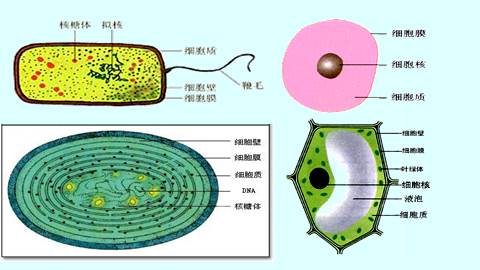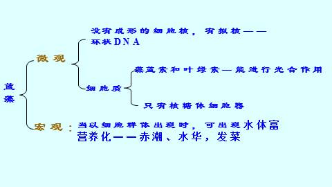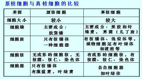 有藻蓝素,叶绿素细胞器有成形的细胞核,有核膜、核仁、染色体无成形的细胞核,无核膜、核仁、染色体细胞核有核糖体、线粒体等,植物细胞还有叶绿体和液泡等只有核糖体