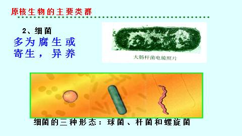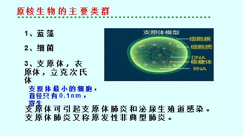 原核生物的主要类群2、细菌细菌的三种形态:球菌、杆菌和螺旋菌多为腐生或寄生,异养原核生物的主要类群1、蓝藻2、细菌3、支原体,衣原体,立克次氏体支原体最小的细胞,直径只有0.1nm,寄生支原体可引起支原体肺炎和泌尿生殖道感染。支原体肺炎又称原发性非典型肺炎。 以细胞为基础的生物分类系统 细胞学说 细胞学说的建立者?