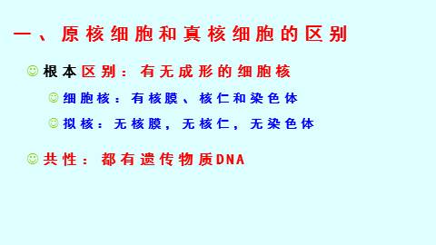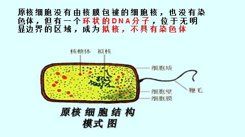 模式图原核细胞没有由核膜包被的细胞核,也没有染色体,但有一个环状的DNA分子,位于无明显边界的区域,成为拟核,不具有染色体一、原核细胞和真核细胞的区别根本区别:有无成形的细胞核