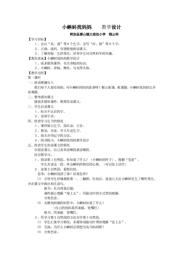 *** 钱某某【学习目标】 1、会认“灰、迎”等8个生字,会写“河、姐”等6个字。 2、正确、流利、有感情地朗读课文。 3、了解青蛙一生的变化,培养学生对自然科学的兴趣。?【教具准备】小蝌蚪找妈妈教学设计 1、或多媒体课件,有关青蛙的知识。 2、小蝌蚪、青蛙、鲤鱼、乌龟等头饰。【教学过程】第一课时一、谈话激趣引入 我们每个人都有妈妈,可小蝌蚪的妈妈是谁呀?揭示新课,板课题:小蝌蚪找妈妈生齐某某课题。二、整体感知课文 播放多媒体课件,教师范读课文。三、学生自读课文 1、标出不认识的字。 2、读准字音。?四、检查学习生字的情况 1、课件展示生字。指名读,正音。 2、教读,齐某某,开火车读生字。 3、指名介绍记字的方法。 4、组词练习。小蝌蚪找妈妈教学设计五、检查学生初读课文的情况 分段读课文,自己喜欢读哪段就读哪段。 结合图学习: 1、指读第1自然段,你知道了什么?(小蝌蚪的样子),理解“甩着”。 学生齐某某这一段,体会蝌蚪的快活的心情。(可以加上动作) 2、读第2自然段,看图比较。 思考:小蝌蚪找到了谁?结果怎样? ⑴ 引导学生仔细观察第一、二幅图,比较后,说说几天后小蝌蚪发生了哪些变化。并在课文中画出相关语句。 板书:长出两条后腿。 课件展示理解“迎上去”,用做动作的方式帮助理解。 分角色读。 ⑵ 从鲤鱼阿姨的回答中,小蝌蚪知道了什么???????? (自己的妈妈是四条腿,宽嘴巴) 板书:四条腿 宽嘴巴。 3、用学习第2自然段的方法自学第3自然段。 ⑴ 学生汇报学习情况,多媒体或做动作帮助理解“追上去”。 ⑵ 交流:为什么小蝌蚪会错把乌龟当妈妈呢? ⑶ 分角色读。六、小结