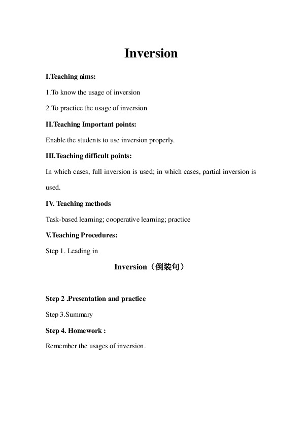 I.Teaching aims:1.To know the usage of inversion2.To practice the usage of inversion