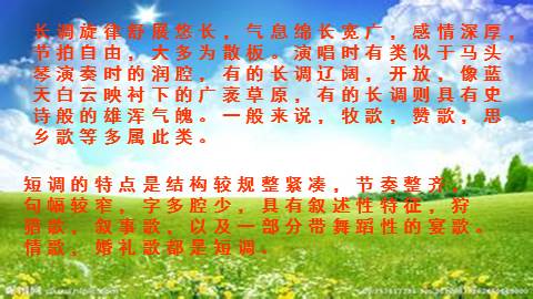 长调旋律舒展悠长,气息绵长宽广,感情深厚,节拍自由,大多为散板。演唱时有类似于马头琴演奏时的润腔,有的长调辽阔,开放,像蓝天白云映衬下的广袤草原,有的长调则具有史诗般的雄浑气魄。一般来说,牧歌,赞歌,思乡歌等多属此类。