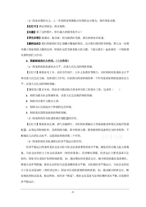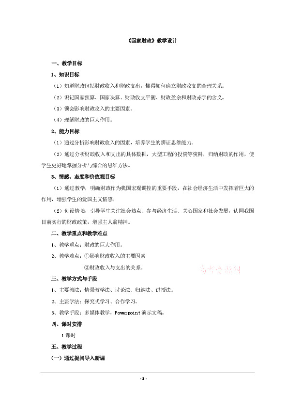(1)通过教学,明确财政作为我国宏观调控的重要手段,在社会经济生活中发挥着巨大的作用,增强学生的爱国主义情感。