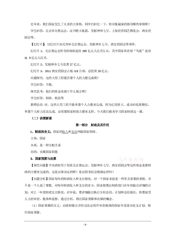(2)创设情境,引导学生关注社会热点、参与经济生活、关心国家和社会发展,认同我国目前实行的财政政策,增强主人翁精神。