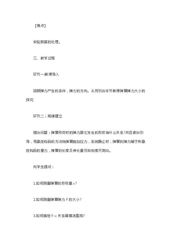 提出问题:弹簧形变时的弹力跟它发生的形变有什么关系?并且做出引导,用悬挂钩码的方法给弹簧施加拉力,系统静止时,弹簧的弹力等于所悬挂钩码的重力,弹簧的长度及伸长量可由刻度尺测出。