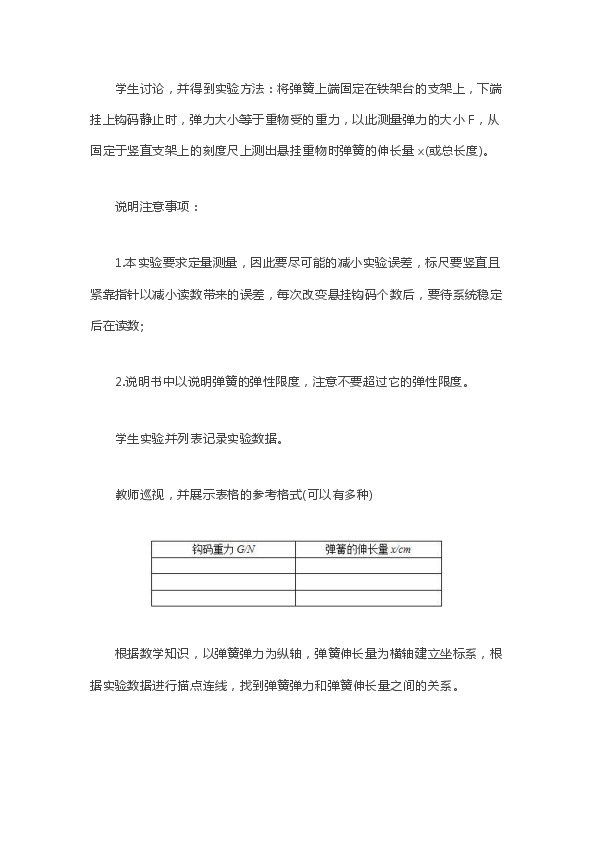 学生讨论,并得到实验方法:将弹簧上端固定在铁架台的支架上,下端挂上钩码静止时,弹力大小等于重物受的重力,以此测量弹力的大小F,从固定于竖直支架上的刻度尺上测出悬挂重物时弹簧的伸长量x(或总长度)。