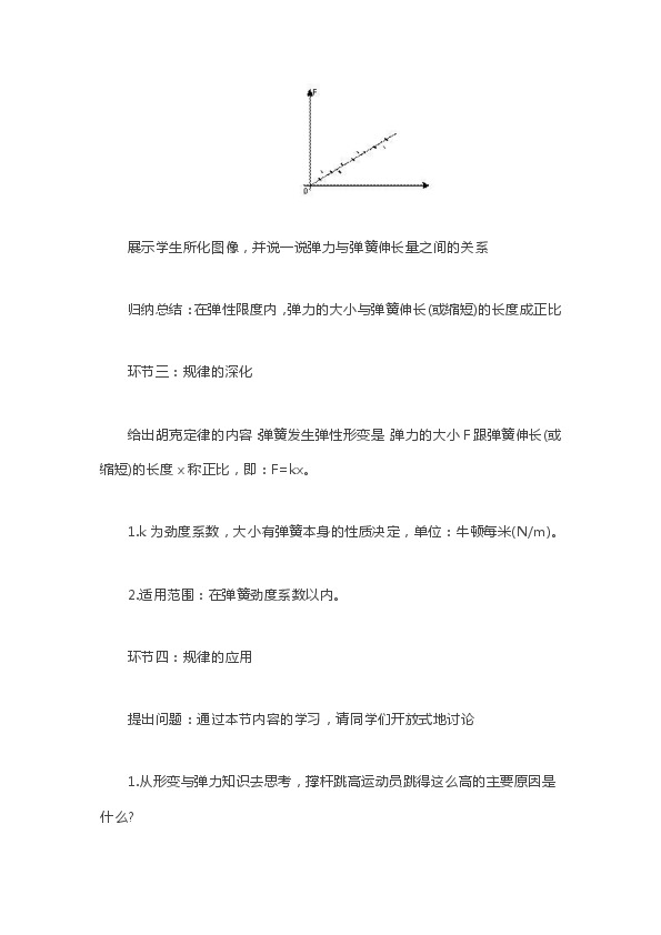 给出胡克定律的内容:弹簧发生弹性形变是,弹力的大小F跟弹簧伸长(或缩短)的长度x称正比,即:F=kx。
