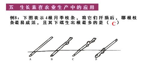 例8:下图表示4根月季枝条,将它们扦插后,哪根枝条最易成活,且其下端生出根最多的是( )