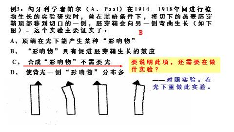 例3:匈牙利学者帕尔(A.Paal)在1914—1918年间进行植物生长的实验研究时,曾在黑暗条件下,将切下的燕麦胚芽鞘顶部移到切口的一侧,胚芽鞘会向另一侧弯曲生长(如下图)。这个实验主要证实了: