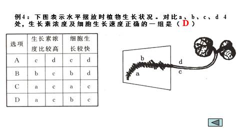 例4:下图表示水平摆放时植物生长状况。对比a、b、c、d 4处,生长素浓度及细胞生长速度正确的一组是( )