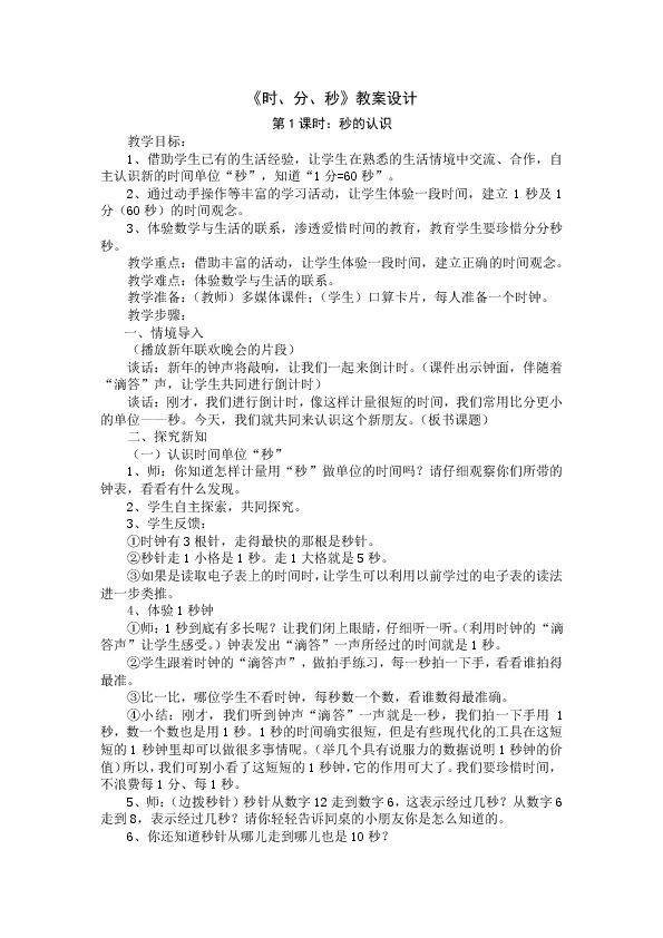2、通过动手操作等丰富的学习活动,让学生体验一段时间,建立1秒及1分(60秒)的时间观念。