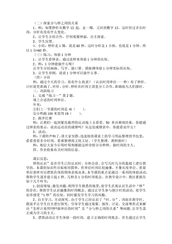 2、自主学习,主动探究。由于学生已经认识了“时、分”,因而在教学时,我放手让学生自主进行探究,引导学生通过观察、操作、讨论、交流等形式来解决“怎样计量用?秒?做单位的时间”及“分与秒之间的关系”等问题。让学生真正成为学习的主人。