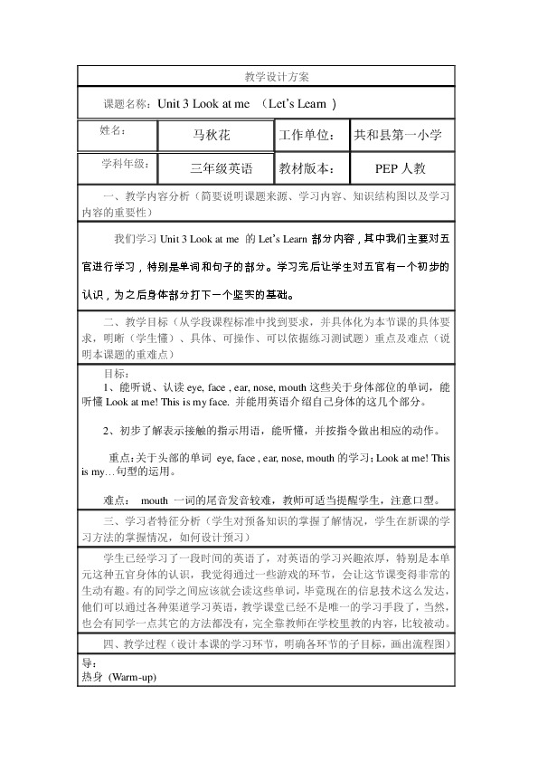 课题名称:Unit 3 Look at me (Let’s Learn)