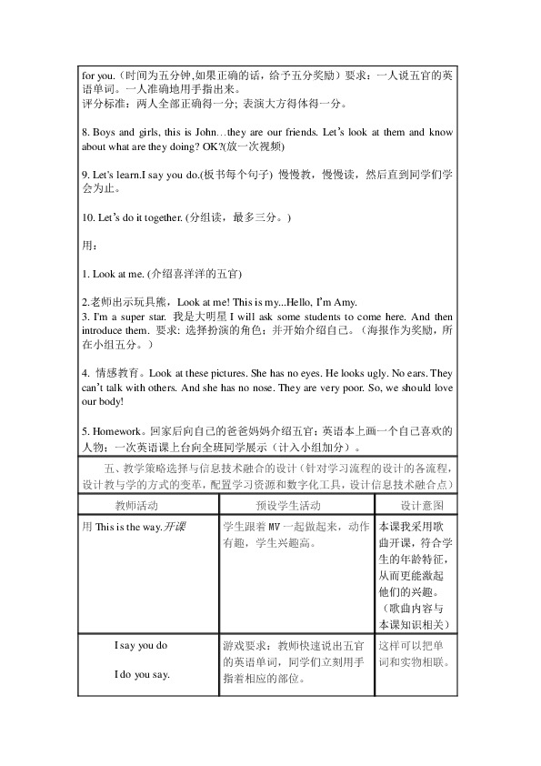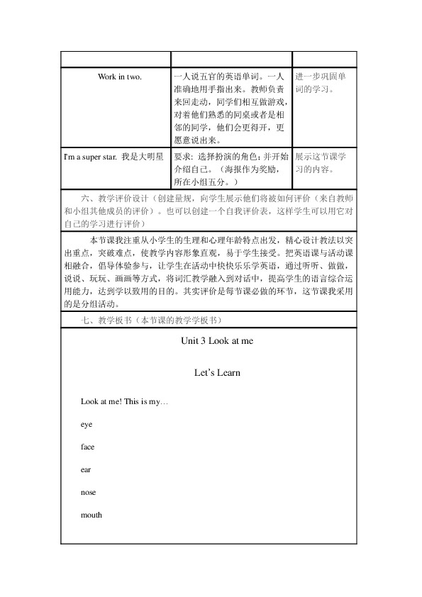 5. Homework。回家后向自己的爸爸妈妈介绍五官;英语本上画一个自己喜欢的人物;一次英语课上台向全班同学展示(计入小组加分)。