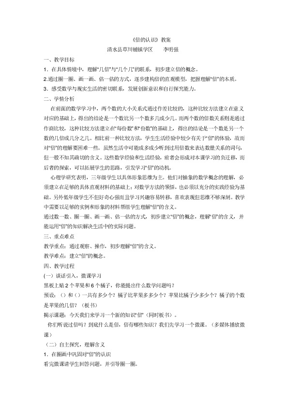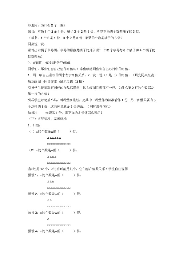 一、教学目标1.在具体情境中,理解“几倍”与“几个几”的联系,初步建立倍的概念。2.通过圈一圈、画一画、估一估的方式,逐步建构倍的直观模型,把握理解“倍”的本质。3.感受数学与现实生活的密切联系,发展创新意识和自行探究能力。二、学情分析??? 在前面的数学学习中,两个数的大小关系式通过作差比较的,这种比较方法建立在意义对应的基础上,得出的结论是一个数比另一个数多几或少几。而两个数的倍数关系则是通过作商比较,这种比较方法建立在“每份数”和“份数”的基础上,得出的结论是一个数是另一个数的几倍或几分之几。相比前一种比较方法,学生生活经验中较少有关于“倍”的体验,故而对“倍”的理解要困难一些。虽然生活中可能或多或少听到过用倍数来表达数量关系的词句,但一般不知其确切的含义。这些数学经验和生活经验,前者会形成对本课学习的负迁移,而后者的探索,可以拓展学生的思路,引发学习“倍”的动机。??? 心理学研究表明,三年级学生以具体形象思维为主。他们对抽象的数学概念的理解,必须建立在足够的具体直观材料的基础上;对数学方法的领悟,也必须以充分的实践经验为基础。另外低年级学生不但好奇心强而且学习兴趣容易转移,喜欢表现但思维不够深刻。教学中需要以足够的实例和形象的材料帮组学生理解“倍”的含义。通过数一数、圈一圈、画一画、估一估的方式,初步建立“倍”的概念,理解“倍”的含义,并能运用“倍”的知识解决生活中的实际问题。三、重点难点教学重点:通过观察、操作,初步理解“倍”的含义。教学难点:建立“倍”的概念。四、教学过程(一)谈话引入,微课学习黑板上贴2个苹果和6个橘子,你能提出什么数学问题吗?预设:()和()一共有多少个?橘子比苹果多多少个?苹果比橘子少多少个?橘子的个数是苹果的几倍?(板书)揭示课题:今天我们来学习一个新的知识“倍”(同时板书)。? 你们听说过倍吗?到底什么是倍,倍有哪些知识?我们先学习一个微课。(多媒体播放微课)(二)自主探究,理解含义1.在圈画中巩固对“倍”的认识看完微课请学生回答问题,并引导圈一圈。师追问:为什么2个一圈?预设:苹果1个2是1份,橘子3个2是3份,所以苹果的个数是橘子的3倍。(板书:1个2是1份?? 3个2是3份? 苹果的个数是橘子的3倍)同桌说一说。课件出示橘子草莓图,草莓的颗数是橘子的几倍呢?(12个草莓与6个橘子和4个橘子的倍数关系)2.在画图中充实对“倍”的理解同学们,那你们会自己创作3倍吗?拿出纸笔画出你自己心目中的3倍。1、画一幅自己喜欢的图来表示3倍关系。2、说一说()是()的3倍。(画完同桌交流)独立画图→同桌交流→展示反馈(3幅)引导学生仔细观察同伴的作品后提问:这3幅图看着都不一样,为什么第2行的个数都是第一行的3倍?引导学生讨论后小结:两种量在比较,把其中一种量作为标准看作1份,另一种量只要有3个这样的1份,这两种量就是3倍关系。(同时课件演示)如果用??????? 来表示1份,那下面的3份该怎么表示?(三)多层练习,完善建构1.口答:(1)□的个数是△的( )倍。 △△△△△△ □□□□□□□□□□□□(2)□的个数是△的( )倍。 △△△△ □□□□□□□□□□□□当□还是12个,△还有可能是几个,它们存在倍数关系?学生自由选择预设1:□的个数是△的( )倍。 △△△ □□□□□□□□□□□□预设2:□的个数是△的( )倍。 △△ □□□□□□□□□□□□预设3:□的个数是△的( )倍。 △ □□□□□□□□□□□□预设4:□的个数是△的( )倍。△△△△△△△△△△△△ □□□□□□□□□□□□