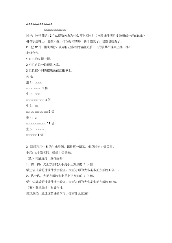 2.把12个□摆成两行,表示自己喜欢的倍数关系。(用学具在课桌上摆一摆)小组合作:1.自己独立摆一摆。2.小组内说一说倍数关系。3.组长把不同的摆法画在汇报单上。预设:生1:□□□□□□□□ □□□□ 2倍生2:□□□□□□ □□□ □□□ 3倍生3:□□□□ □□ □□ □□ □□ 5倍生4:□□□□□□□□□□□□ 11倍生5:□□□□□□□□□□□□ 1倍XXXXXXXXXX3. 适时利用生5的生成资源,课件逐一演示,重点讨论1倍关系。小结:□个数相同,就是1倍关系。(四)拓展练习,深化提升1.估一估:大正方形的大小是小正方形的( )倍。学生估计后通过课件演示验证:大正方形的大小是小正方形的4倍。。2.估一估:大正方形的大小是小正方形的( )倍。学生估算后通过课件演示验证:大正方形的大小是小正方形的16倍。(五)课堂总结,布置作业课堂总结:通过这节课的学习,你有什么收获?