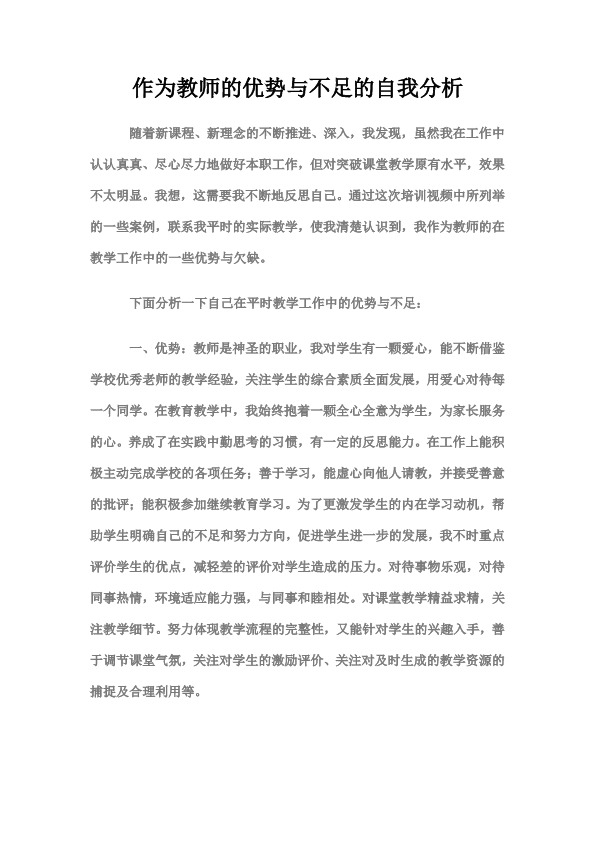 以上为《作为教师的优势与不足的自我分析》的无排版文字预览,完整格式请下载