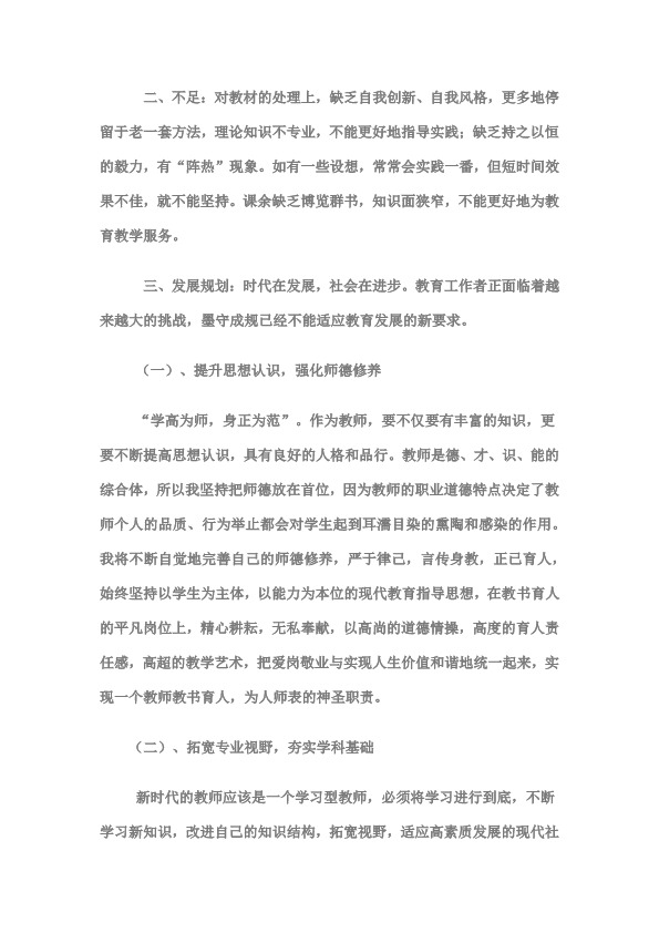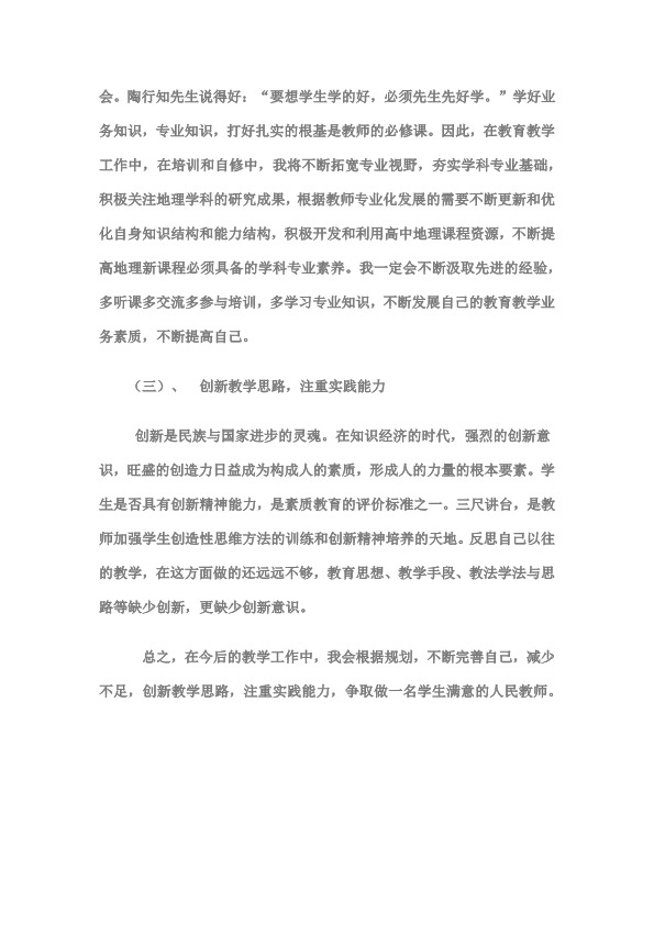 ???总之,在今后的教学工作中,我会根据规划,不断完善自己,减少不足,创新教学思路,注重实践能力,争取做一名学生满意的人民教师。