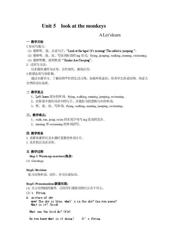 1、Let’s learn部分的单某某:flying, walking, running, jumping, swimming.