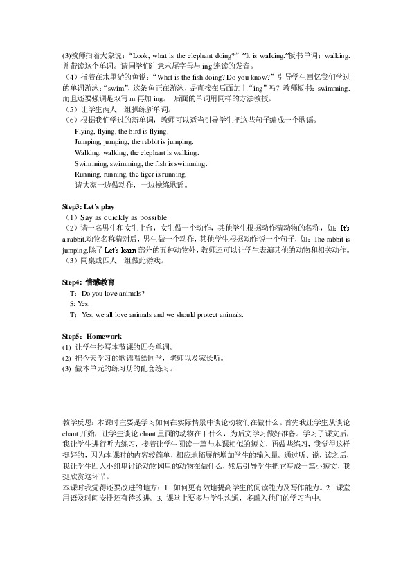 教学反思:本课时主要是学习如何在实际情景中谈论动物们在做什么。首先我让学生从谈论chant开始,让学生谈论chant里面的动物在干什么,为后文学习做好准备。学习了课文后,我让学生进行听力练习,接着让学生阅读一篇与本课相似的短文,再做些练习,我觉得这样挺好的,因为本课时的内容较简单,相应地拓展能增加学生的输入量。通过听、说、读之后,我让学生四人小组里讨论动物园里的动物在做什么,然后引导学生把它写成一篇小短文,我挺欣赏这环节。