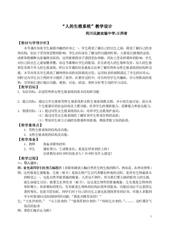本节课内容是学生最感兴趣的内容之一,学生渴望了解自己的出生之谜,渴望了解自己的身体结构,但由于受传统思想的影响,学生在向家长了解这些问题的时候,大都是以搪塞的态度,或者即使解释也是偏离实际的,这样就使得孩子感到更加神秘,再加上受各种媒体的影响,学生对自己的出生之谜似懂非懂,而这节课顺应学生的愿望,首先讲述人的生殖和发育,而人的生殖和发育离不开人的生殖系统,所以本节课的任务就是认识和了解男性和女性生殖系统的结构和功能。本节内容从学生渴望了解两性知识的实际情况出发,运用较多的插图满足了学生的好奇心,同时也为学生自主性的学习提供了条件。在教学过程中,可以利用学生兴趣浓,学习热情高的优势,引导他们进行提出问题,观察,讨论,阅读,资料分析等主动的学习活动。
