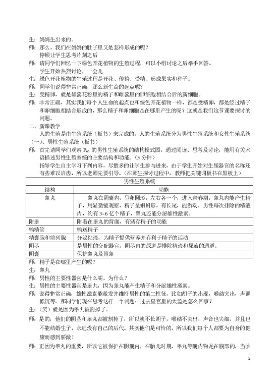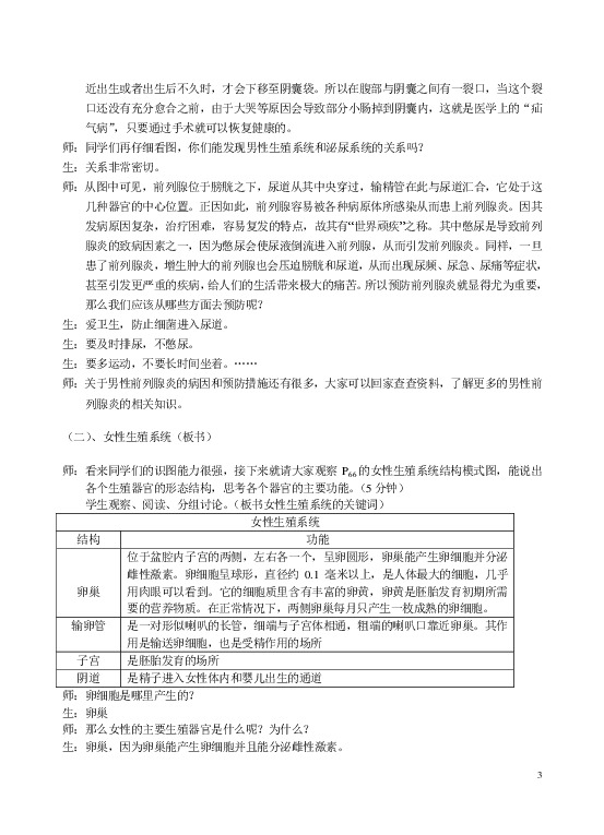 师:非常正确,其实我们每个人生命的起点也和绿色开花植物一样,都是受精卵,都是经过精子和卵细胞相结合形成的,那么精子和卵细胞是在哪里产生的呢?这就是我们这节课要探讨的问题。