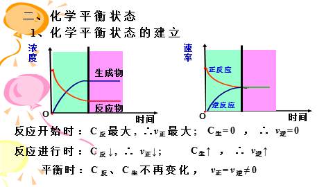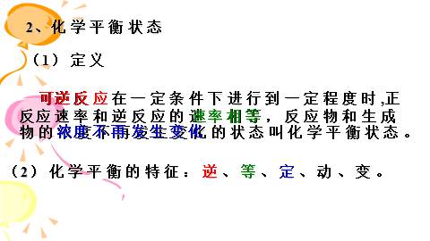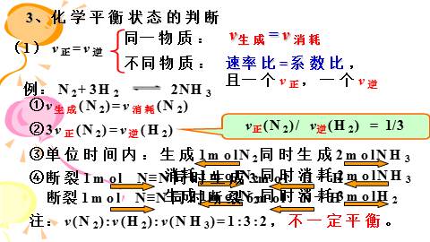 反应方向进行的反应可逆反应③可逆反应有一定的限度。 (2)大部分化学反应都是可逆反应。用“ ”(3)可逆反应的特点: ①正反应和逆反应发生的条件相同; ②反应物、生成物共同存在;(反应不彻底)1、化学平衡状态的建立二、化学平衡状态平衡时:C反、C生不再变化, v正=v逆≠0反应开始时:C反最大, ∴v正最大;反应进行时:C反↓, ∴ v正↓; C生=0 , ∴ v逆=0C生↑ , ∴ v逆↑2、化学平衡状态 可逆反应在一定条件下进行到一定程度时,正反应速率和逆反应的速率相等,反应物和生成物的浓度不再发生变化的状态叫化学平衡状态。(1)定义(2)化学平衡的特征:逆、等、定、动、变。可逆反应速率相等浓度不再发生变化3、化学平衡状态的判断(1)v正=v逆v生成=v消耗速率比=系数比,