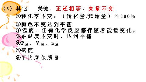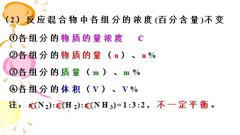 且一个v正,一个v逆①v生成(N2)=v消耗(N2)③单位时间内:生成1molN2同时生成2molNH3消耗1molN2同时消耗2molNH3生成1molN2同时消耗3molH2同一物质:不同物质:②3v正(N2)=v逆(H2)v正(N2)/ v逆(H2) = 1/3④断裂1mol N≡N同时生成3mol H-H断裂1mol N≡N同时断裂6mol N-H注:v(N2):v(H2):v(NH3)=1:3:2,不一定平衡。(2)反应混合物中各组分的浓度(百分含量)不变①各组分的物质的量浓度 C②各组分的物质的量(n)、n%③各组分的质量(m)、m%④各组分的体积(V)、V%注:n(N2):n(H2):n(NH3)=1:3:2,不一定平衡。C C C(3)其它关键:正逆相等,变量不变①转化率不变:(转化量/起始量)×100%④P总,V总,n总②颜色不变达到平衡⑤密度⑥平均摩尔质量③温度:任何化学反应都伴随着能量变化,体系温度不变时,达到平衡[全文已结束,注意以上仅为全文的文字预览,不包含图片和表格以及排版]