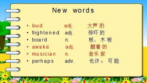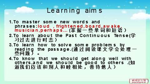 1.To master some new words and phrases:loud , frightened,board,awake, musician,perhapsXXXXX(掌握一些单词和短语)