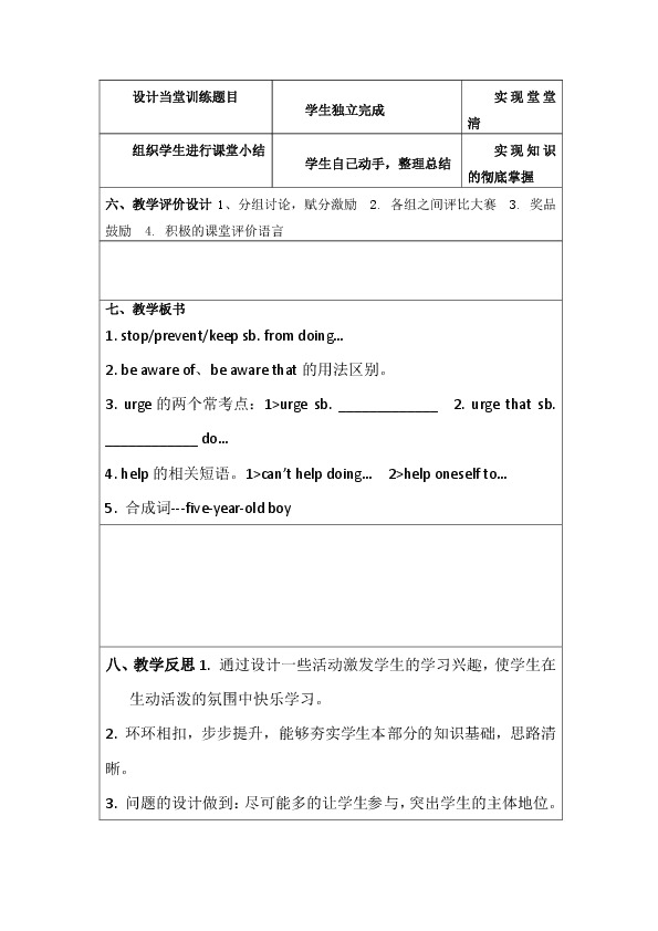 六、教学评价设计1、分组讨论,赋分激励 2. 各组之间评比大赛 3. 奖品鼓励 4. 积极的课堂评价语言