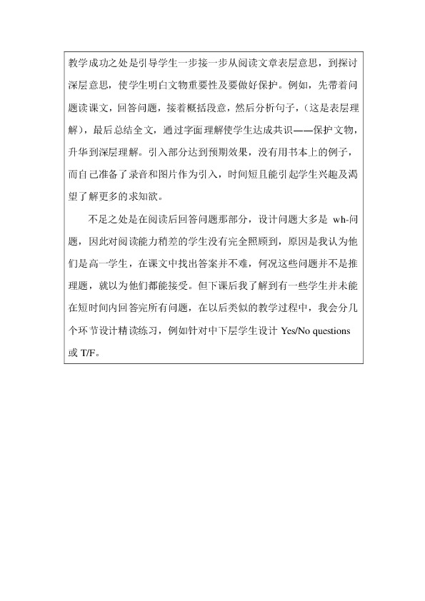 3. 问题的设计做到:尽可能多的让学生参与,突出学生的主体地位。教学成功之处是引导学生一步接一步从阅读文章表层意思,到探讨深层意思,使学生明白文物重要性及要做好保护。例如,先带着问题读课文,回答问题,接着概括段某某,然后分析句子,(这是表层理解),最后总结全文,通过字面理解使学生达成共识 保护文物,升华到深层理解。引入部分达到预期效果,没有用书本上的例子,而自己准备了录音和图片作为引入,时间短且能引起学生兴趣及渴望了解更多的求知欲。? 不足之处是在阅读后回答问题那部分,设计问题大多是 wh-问题,因此对阅读能力稍差的学生没有完全照顾到,原因是我认为他们是高一学生,在课文中找出答案并不难,何况这些问题并不是推理题,就以为他们都能接受。但下课后我了解到有一些学生并未能在短时间内回答完所有问题,在以后类似的教学过程中,我会分几个环节设计精读练习,例如针对中下层学生设计Yes/No questions或T/F。